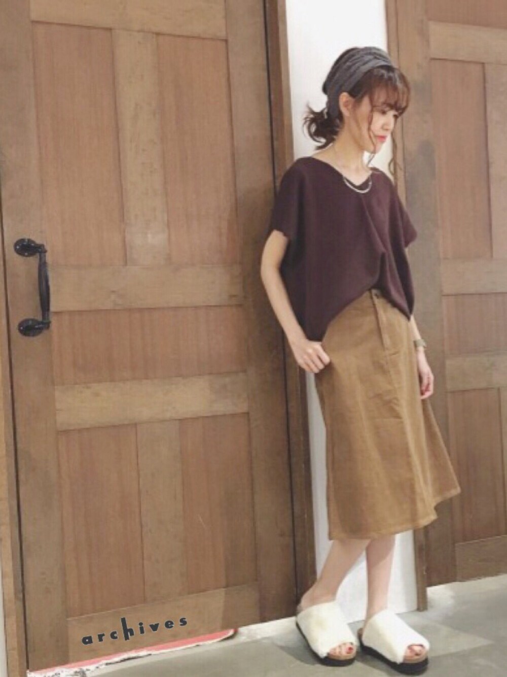 ドルマンニットに コーデュロイのフレアスカートの ブラウスコーデ。 ファーサンダルで トレンド感をプラス