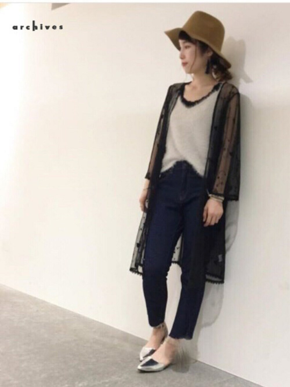 フワフワの手触りがやみつきな フェザーのキャミソールに チュールレースの黒ガウンで 抜け感をプラスして カットオフデニムで 甘辛MIXスタイル♩