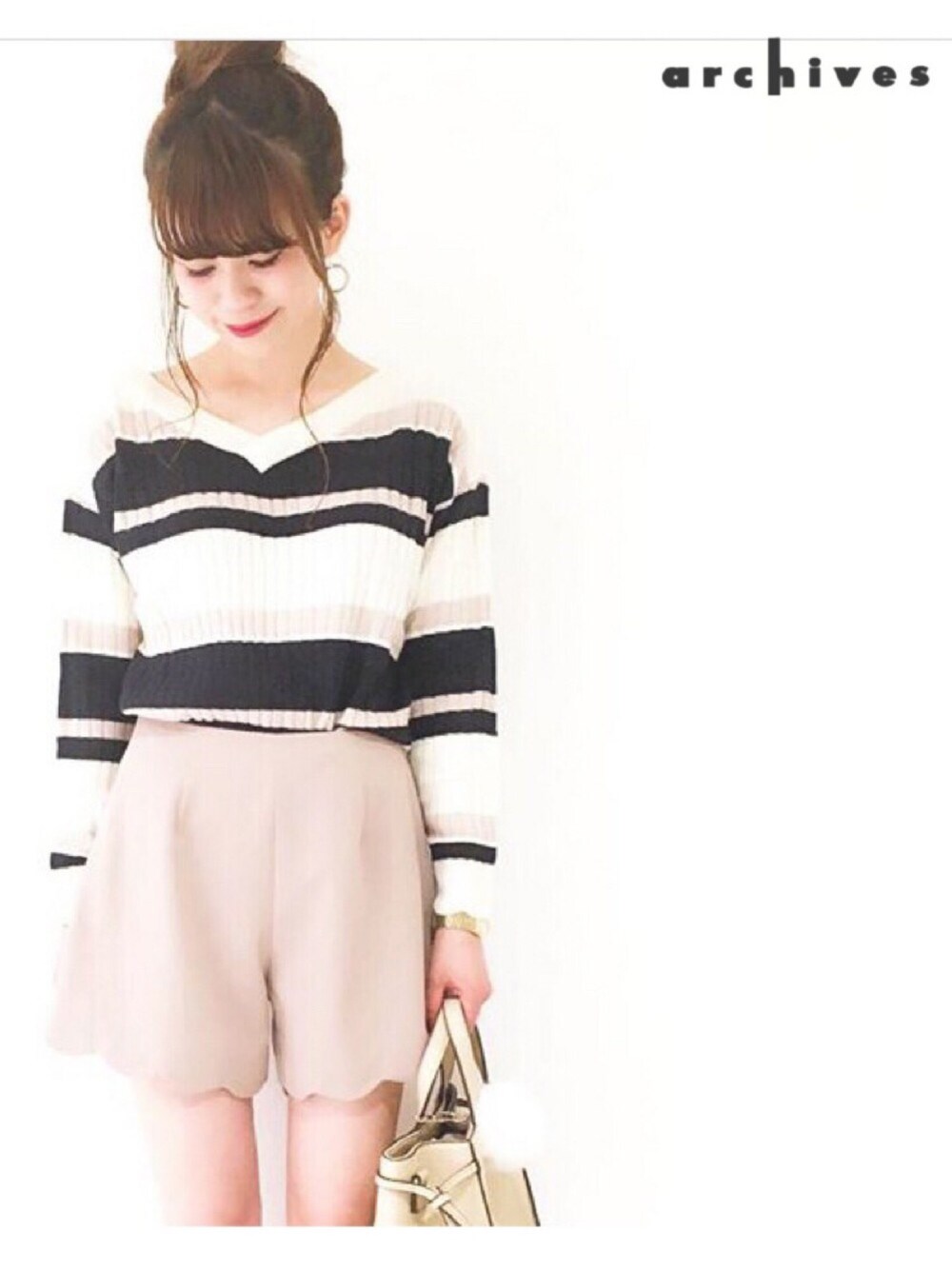 マルチボーダーのゆるニットに スカラップヘムのショートパンツで 秋のスモーキーパステルコーデ