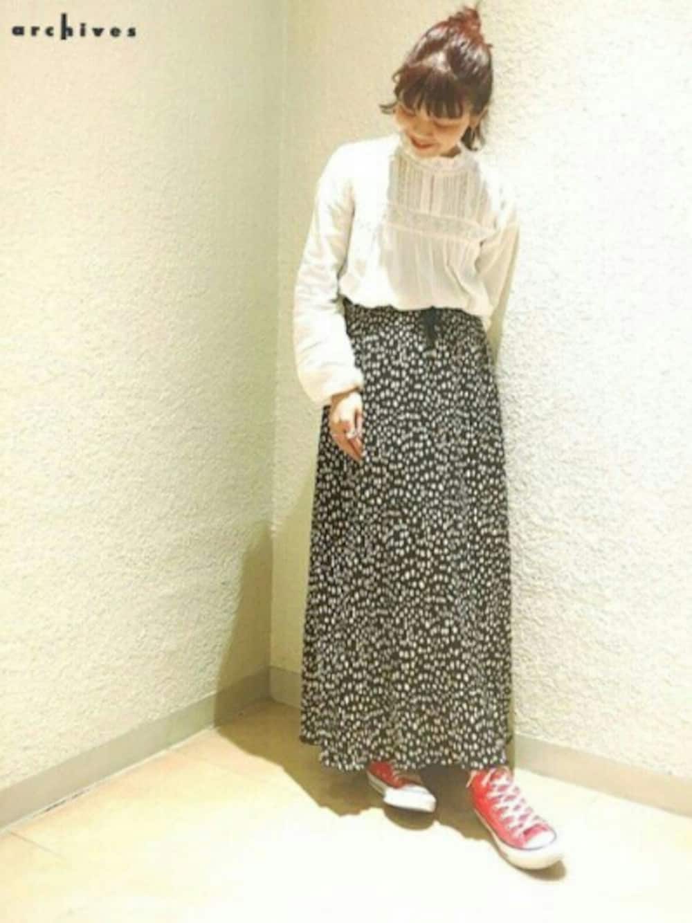 ひょう柄のスカートを ブラウスで女性らしく 足元はスニーカーで カジュアルに