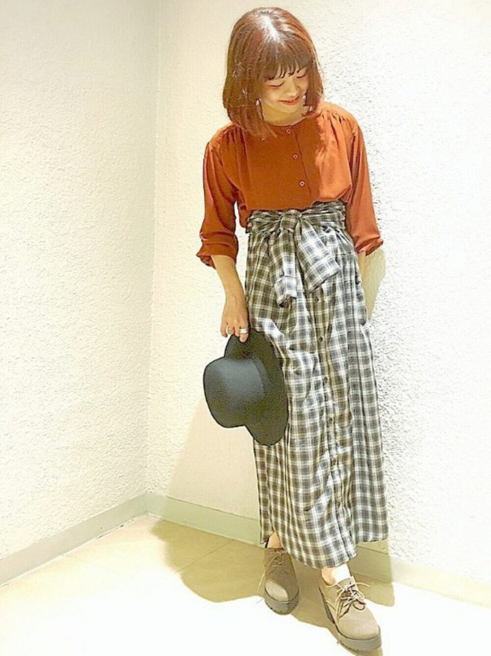 秋カラーのブラウスに シャツワンピをスカート風に 腰巻きアレンジの 上級コーディネート。 ファーサンダルで トレンドライクにしても◎