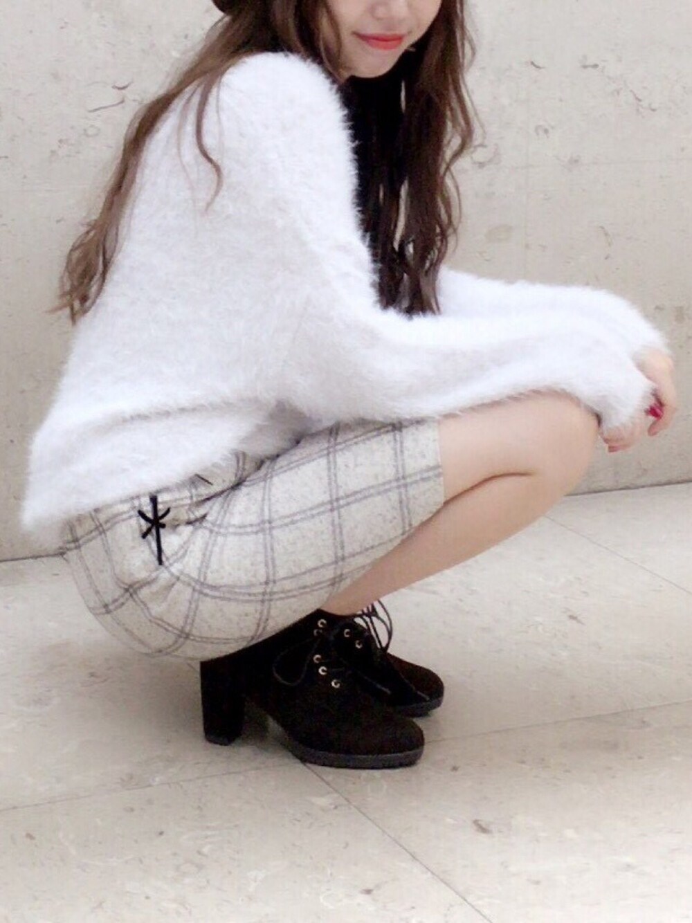 フワフワのテンタッチニットに レース編みが可愛いスカートの ワントーンコーデ。 ブラックをアクセントに 大人ガーリースタイル。