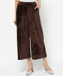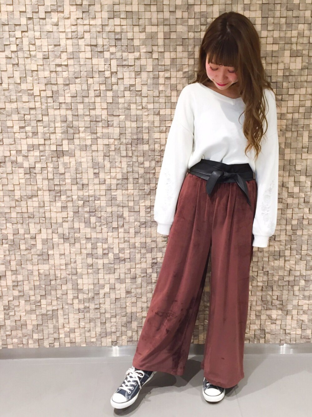 ベロアのワイドパンツに 袖の刺繍がアンティークなニット。 ゆるコーデもサッシュベルトで メリハリとトレンド感をプラス◎