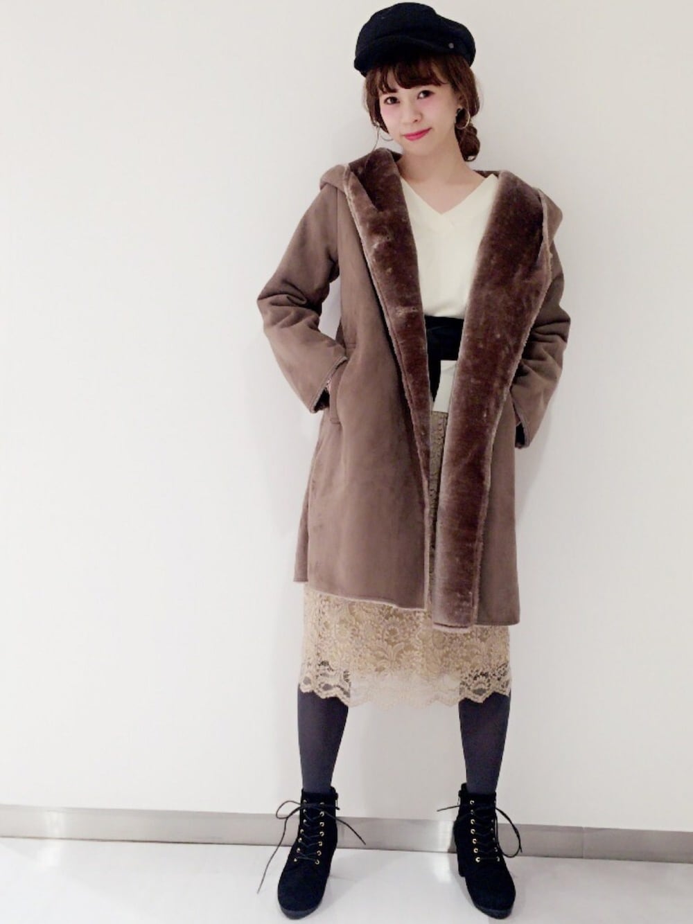 レーススカートのフェミニンスタイルを トレンド小物で旬顔に。 予約受付で一番人気だった レディなレースアップブーツは 通常販売スタートいたしました✨ カジュアルにもキレイめにも大活躍の こちらのフェイクムートンコートは ZOZOTOWNにて先行予約受付中♩ 今度、カジュアルバージョンも アップしますね^_^