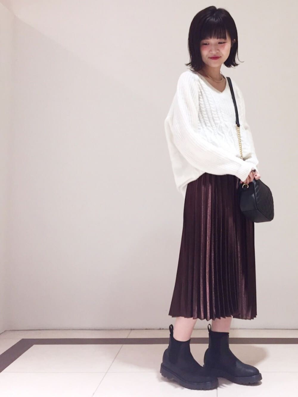 ケーブルのだぼゆるニットに シャイニーなサテンプリーツでガーリー ブラック小物で引き締め▲