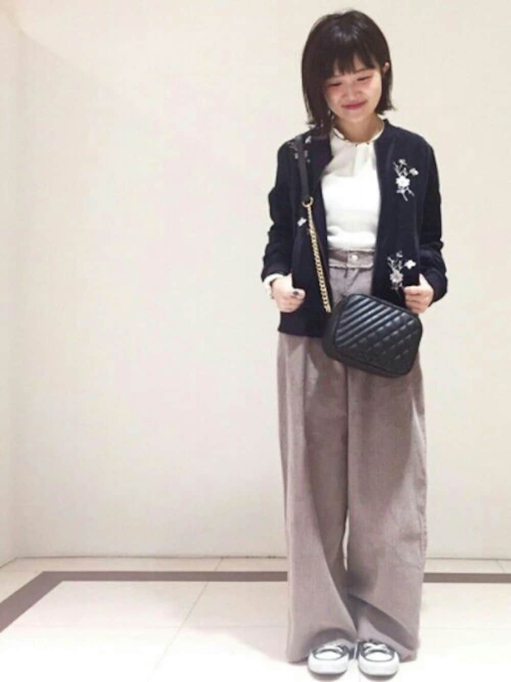 刺繍ブルゾンと コーデュロイのワイドパンツで トレンドコーデ 足元はスニーカーでカジュアルに