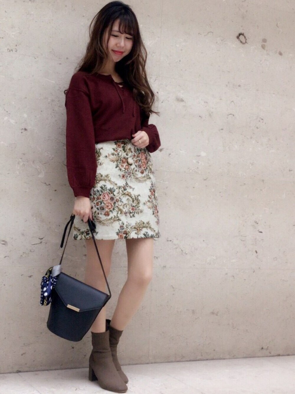 レースアップが可愛いニットに 今期マストなゴブランスカートで ヴィンテージガーリーコーデ🌹 チャンキーヒールでスタイルアップ✨