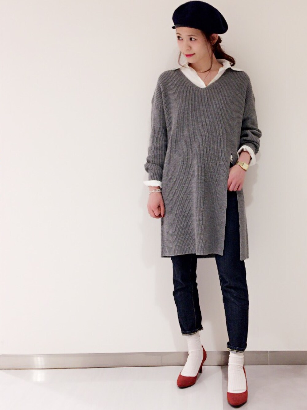 だぼゆるなニットワンピースは 片方のみに入ったスリットが◎ シャツ合わせでハンサムレディに。 白ソックス×赤パンプスで フレンチカジュアルスタイル👠 ※こちらのニットワンピースは ZOZOTOWN限定アイテムです