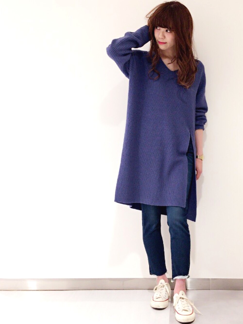 サックスブルーがキレイな サイドスリットワンピースを カットオフデニムでラフに。 ※こちらはZOZOTOWN限定 アイテムです