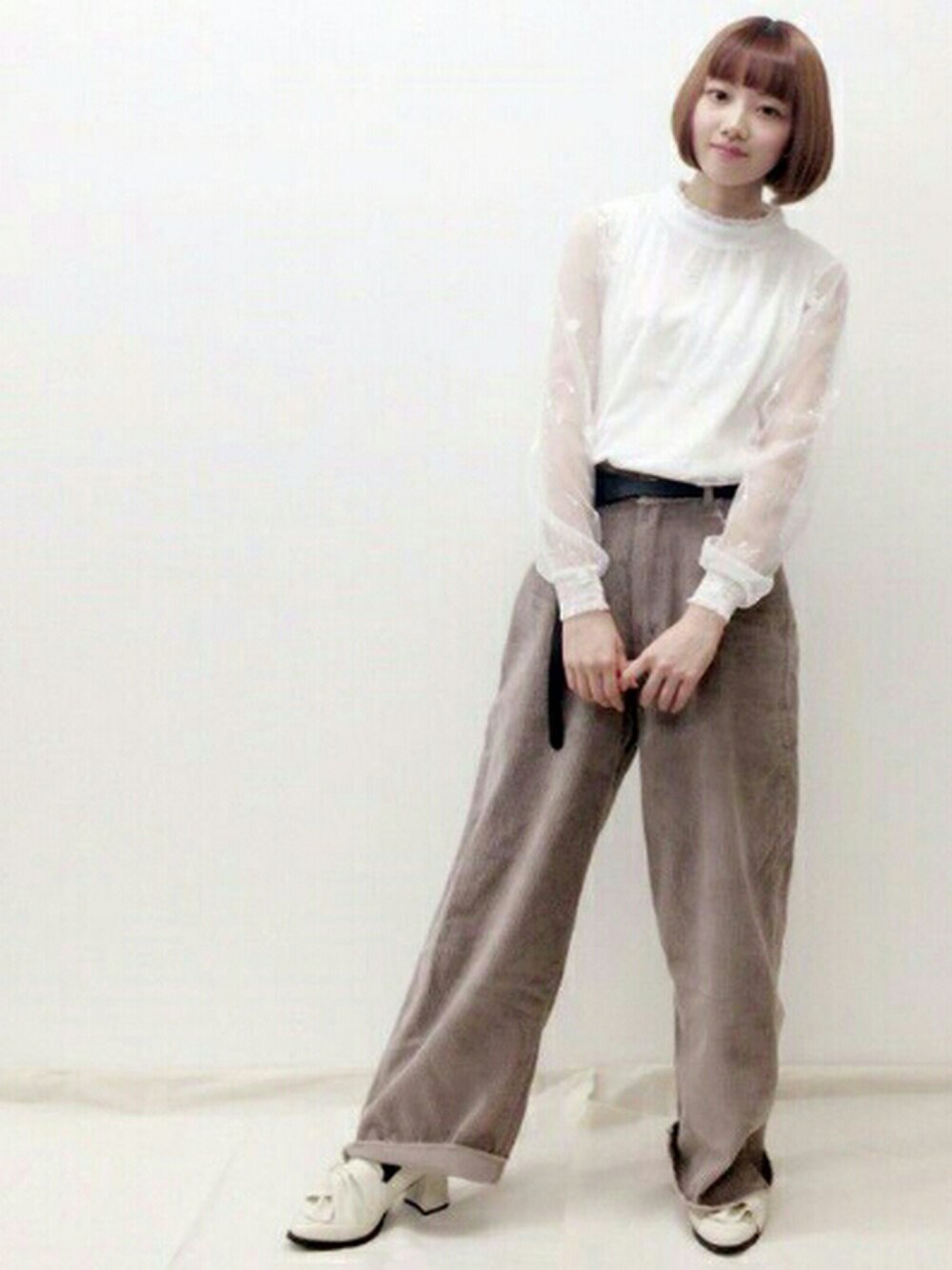 チュール刺繍のレーストップスと コーデュロイのワイドパンツで トレンドミックスコーデ☆ レーストップスは ニットのインナーとしても使えます! Instagramもプロフィールから とべるので是非ご覧ください♪