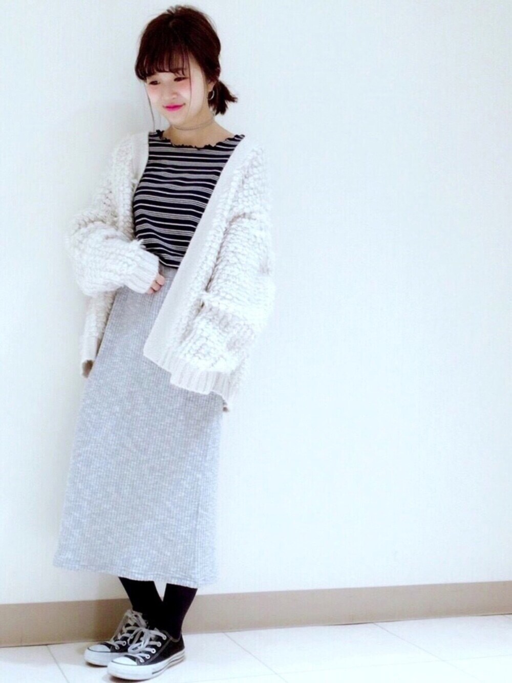 ループ編みカーディガンを ミモレ丈のニットスカートで たまには大人めリラックススタイル❤︎ 🍥model:まるこ🍥 個性派カジュアルなまるこのwearも ゼヒcheckしてみてください♩