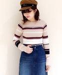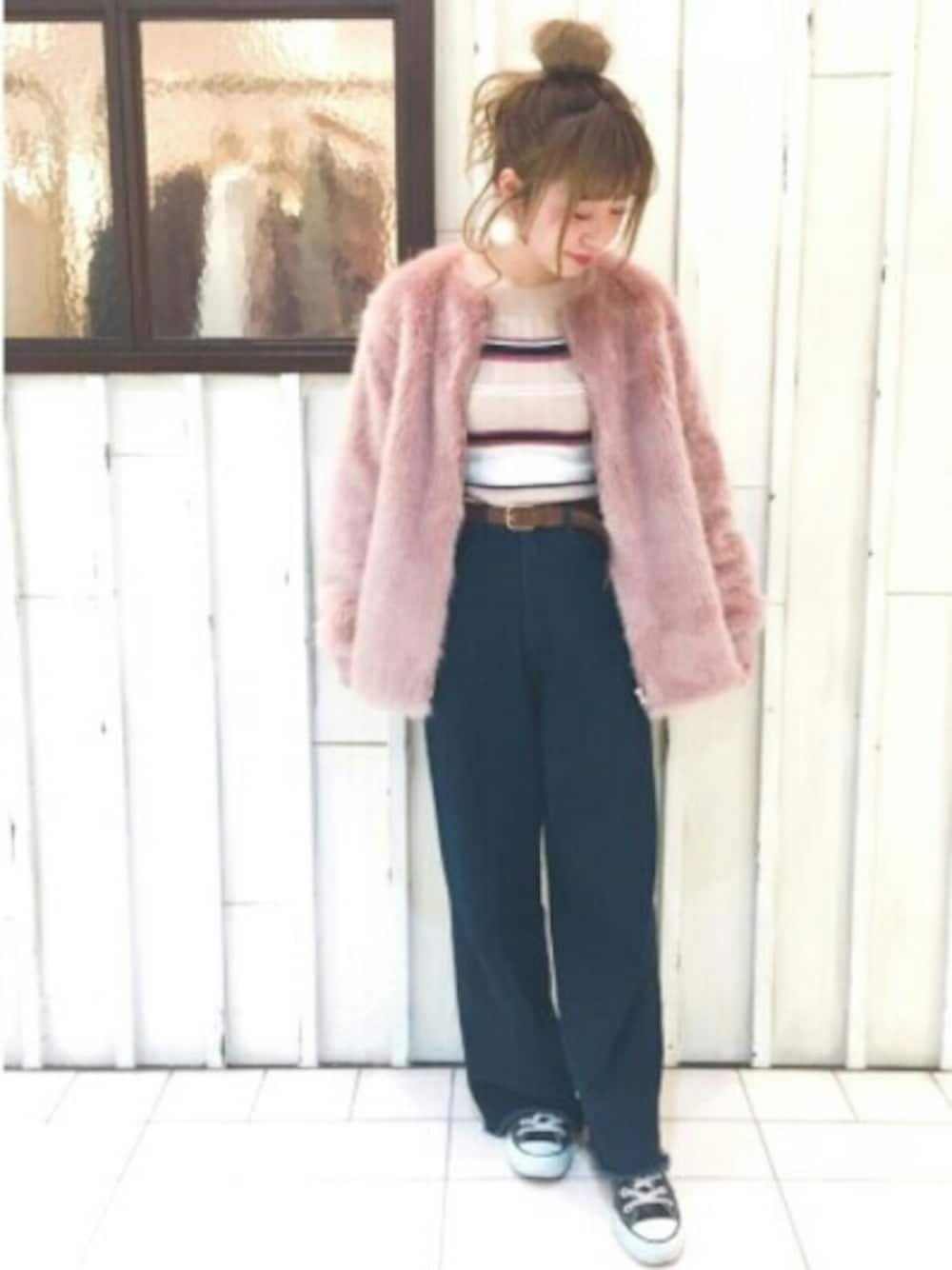 ピンクのファーコートは マルチボーダーのニットと デニムのワイドパンツで カジュアルに Instagramもプロフィールから とべるので、是非ご覧ください♪