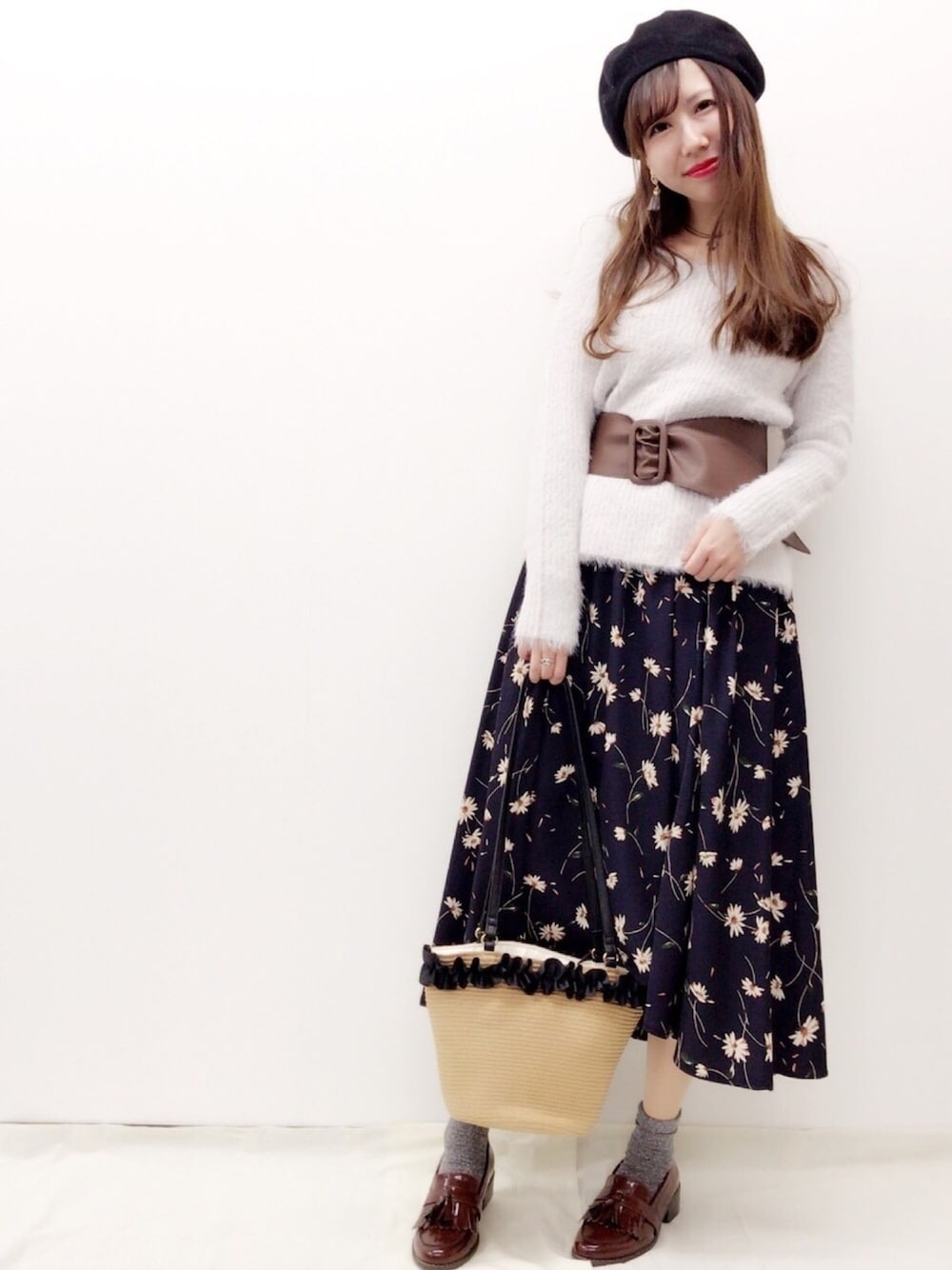 花柄スカートで レトロカジュアルにコーデ♡ 人気のサッシュベルトは 春まで使えるトレンドアイテム! 🌹model:ayaka🌹 トレンドフェミニンなayakaのwearも ゼヒcheckしてみてください♩