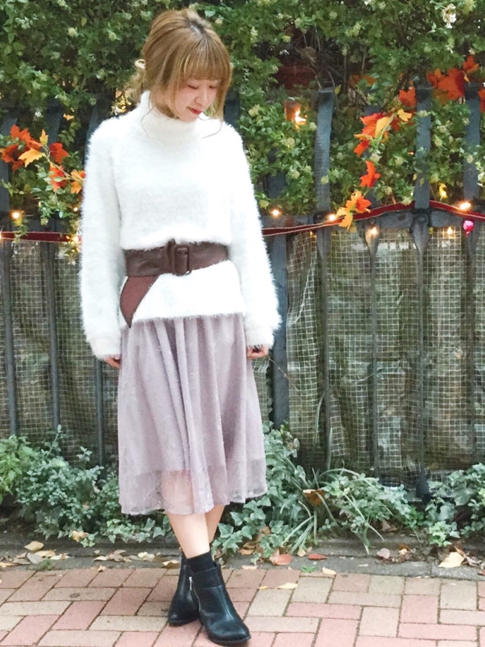 白のオフタートルと レーススカートの 甘めスタイリングも サッシュベルトで今年らしく✨ instagramにもプロフィールからとべるので 是非ご覧ください💕