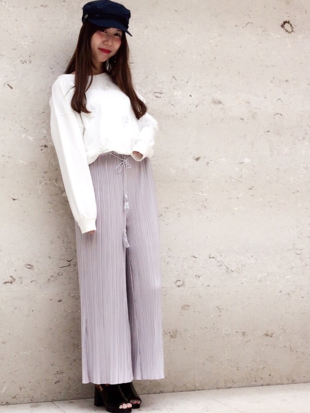 刺繍がポイントのスウェット カジュアルになりすぎないように プリーツワイドパンツで トレンドカジュアルに✨ 🌹model:ayaka🌹 トレンドフェミニンなayakaのwearも ゼヒcheckしてみてください♩