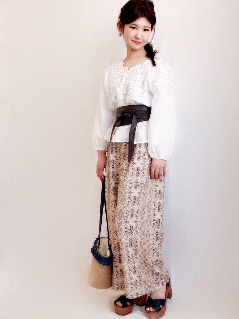 ダマスク柄のワイドパンツを ブラウスと合わせて 春のコーデに サッシュベルトをプラスするだけで トレンド感もアップ⤴︎⤴︎ 💐model:yoshimi💐 甘めカジュアルなyoshimiのwearも ゼヒcheckしてみてください♩