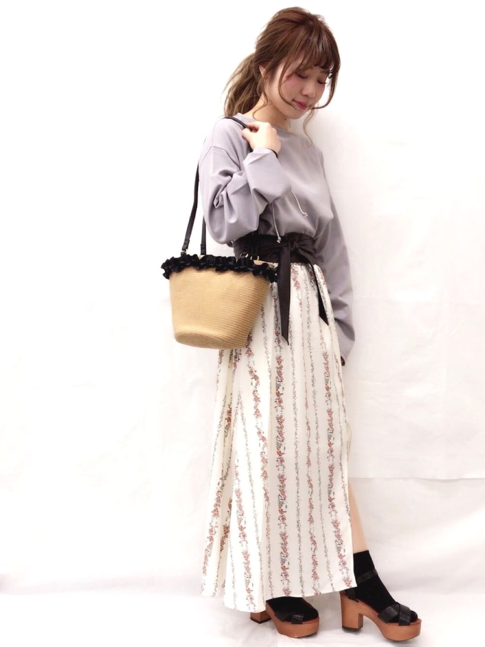 ロングスカートも白の小花柄をチョイスすれば春らしく大人な印象に✨ サッシュベルトでさらにスタイルアップ💕 🎀model:erina🎀 ガーリーゆるカジュアルなerinaのwearも ゼヒcheckしてみてください❤︎