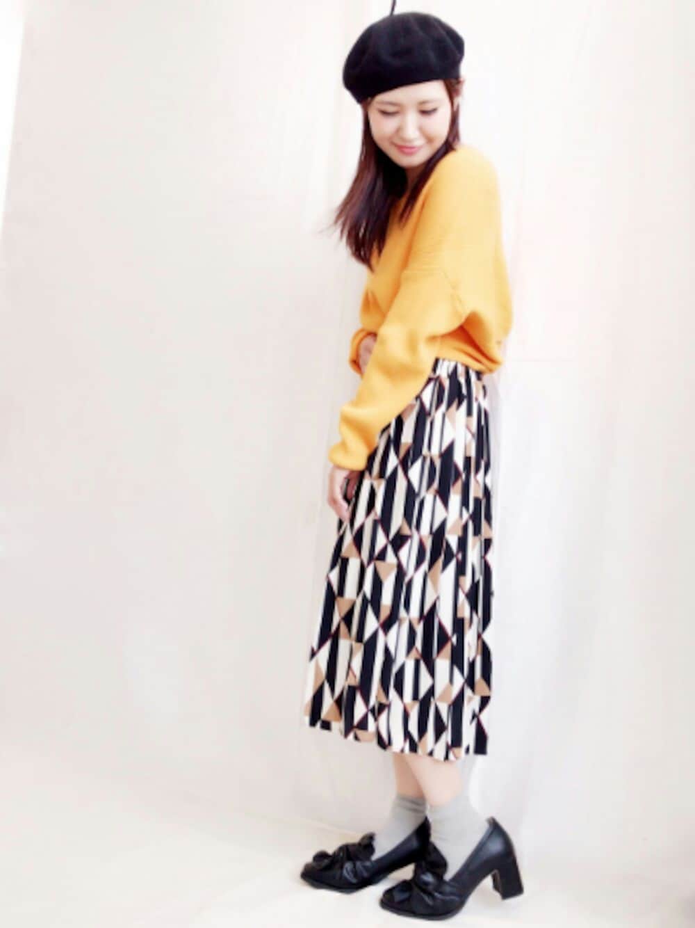 プリーツスカートも幾何学柄なら大人めに ニットは2wayで着用できます 💐model:yoshimi💐 甘めカジュアルなyoshimiのwearも ゼヒcheckしてみてください♩