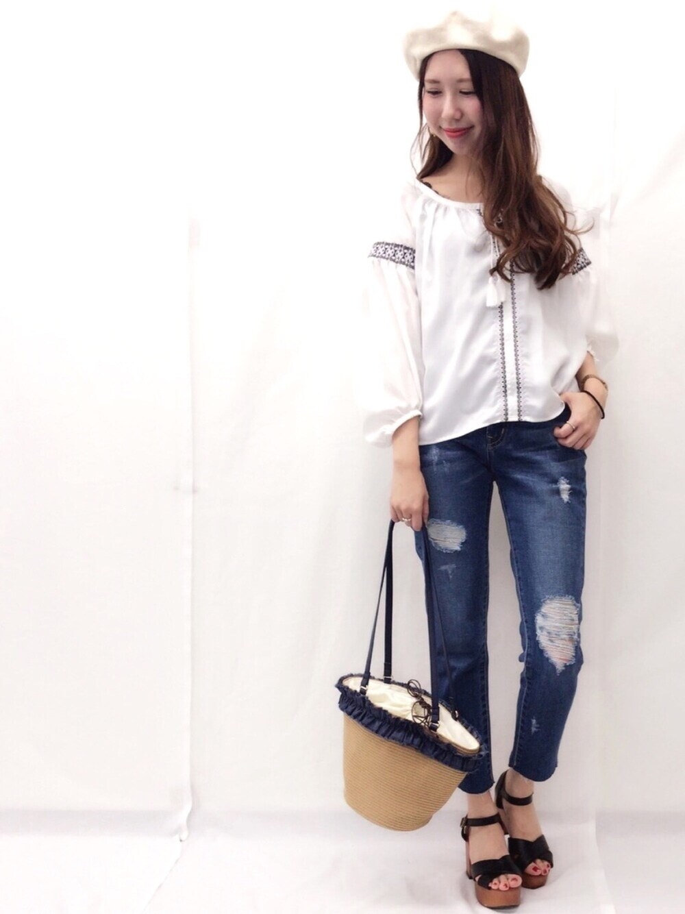 花柄や甘めのテイストに飽きたら ちょっと匂いの違う刺繍ブラウスで差をつけて✨ ダメージデニムでハンサムに仕上げるのが今の気分。。 🌹model:ayaka🌹 トレンドフェミニンなayakaのwearも ゼヒcheckしてみてください♩
