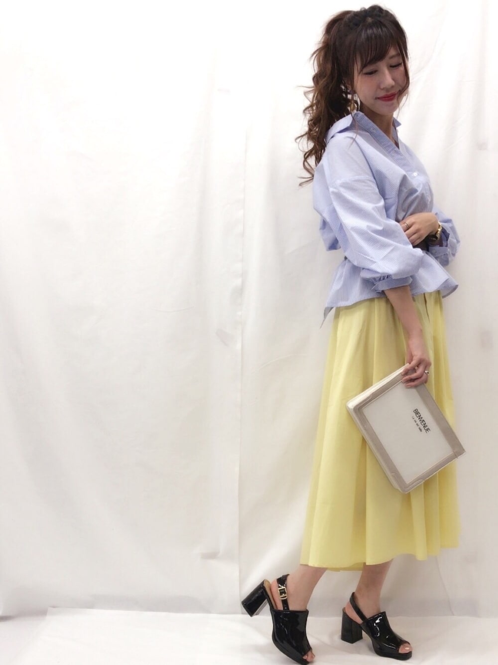 イエローのスカートをメインに ストライプシャツ合わせで 爽やかな大人スタイル✨ 🌹model:ayaka🌹 トレンドフェミニンなayakaのwearも ゼヒcheckしてみてください♩