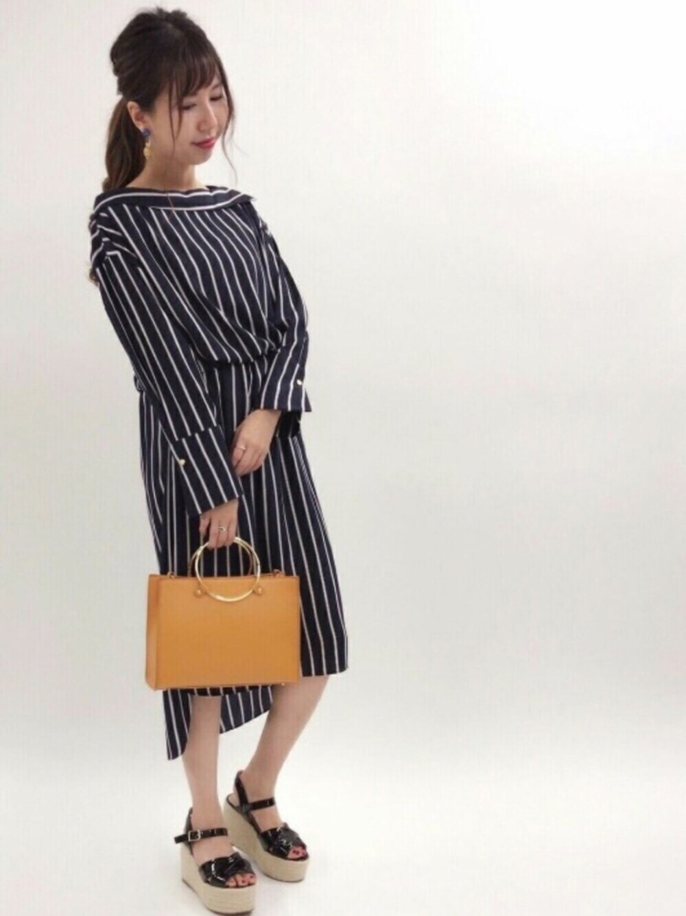 きちんと感もでるストライプワンピースに トレンドのリングバックをセレクトして きれいめスタイル♪ ワンピースは肩を落としてワンショルダー でも着用できます✨ 🌹model:ayaka🌹 トレンドフェミニンなayakaのwearも ゼヒcheckしてみてください♩