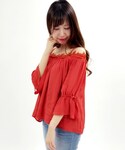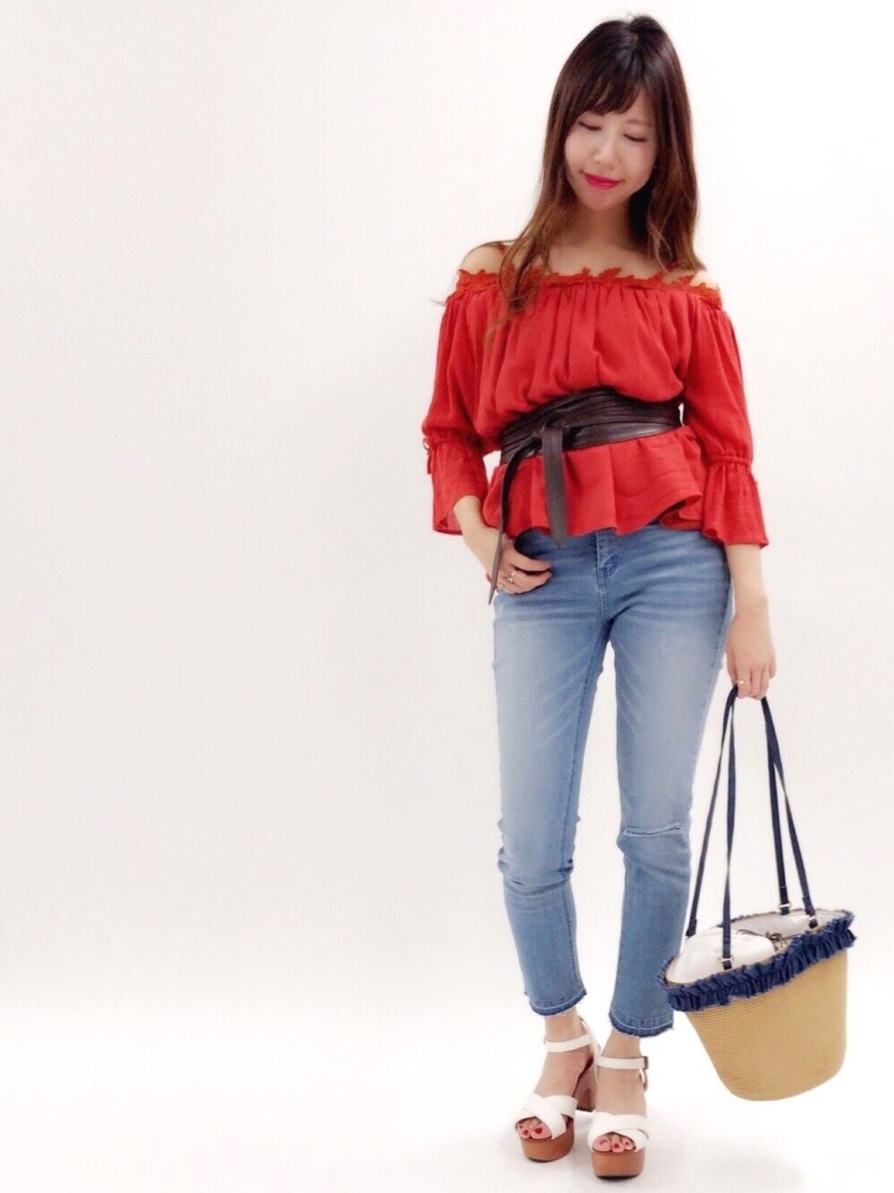 ブラウス×デニムのシンプルコーデ✨ かごバッグとサッシュベルトでトレンドを取り入れて💕 オレンジみたいな赤が今の気分。。 🌹model:ayaka🌹 トレンドフェミニンなayakaのWEARも ゼヒCheckしてみてください♩