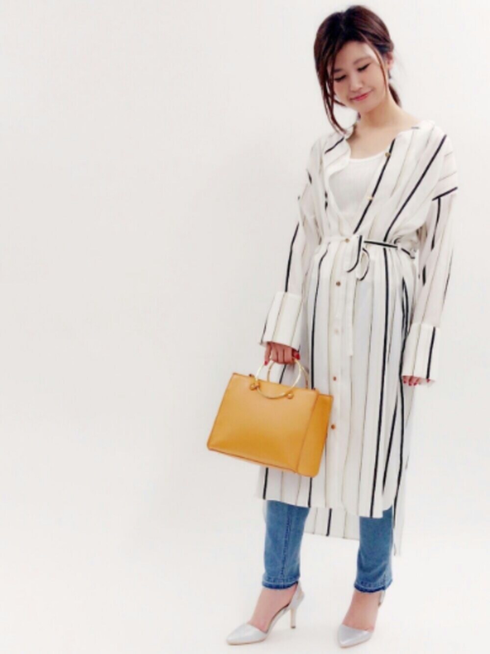 今年トレンドのガウンワンピは 細めのストライプ柄と金釦で大人めに デニムと合わせたきれいめカジュアルスタイル 💐model:yoshimi💐 甘めカジュアルなyoshimiのwearもゼヒcheckしてみてください♩