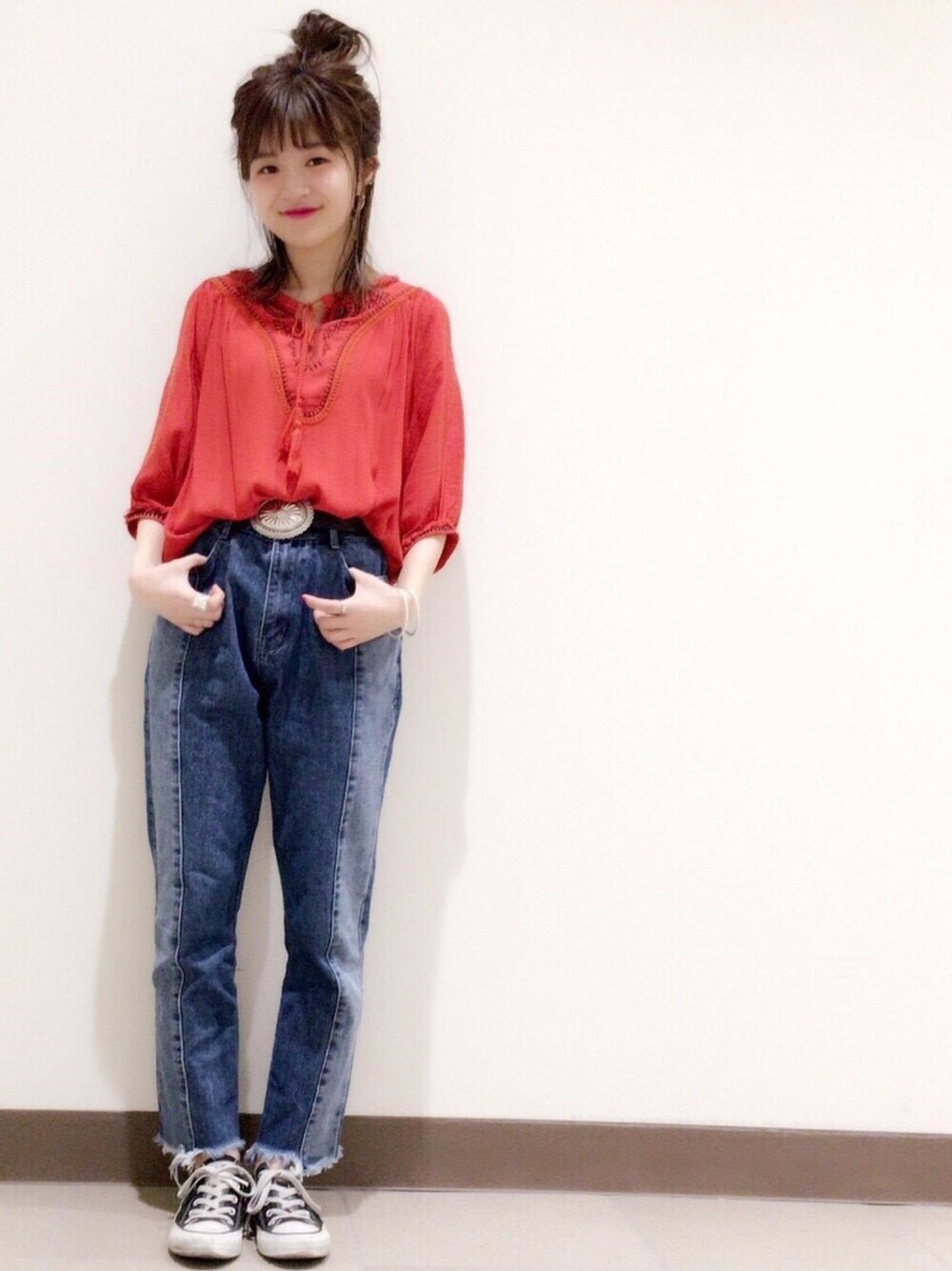 シンプルで合わせやすい でもオシャレな✨ 配色デニムパンツ! 刺繍ブラウスも これからのシーズンにピッタリな オレンジをチョイスして カジュアルなサマーコーデ 🍥model:まるこ🍥 個性派カジュアルなまるこのwearもゼヒcheckしてみてください♩