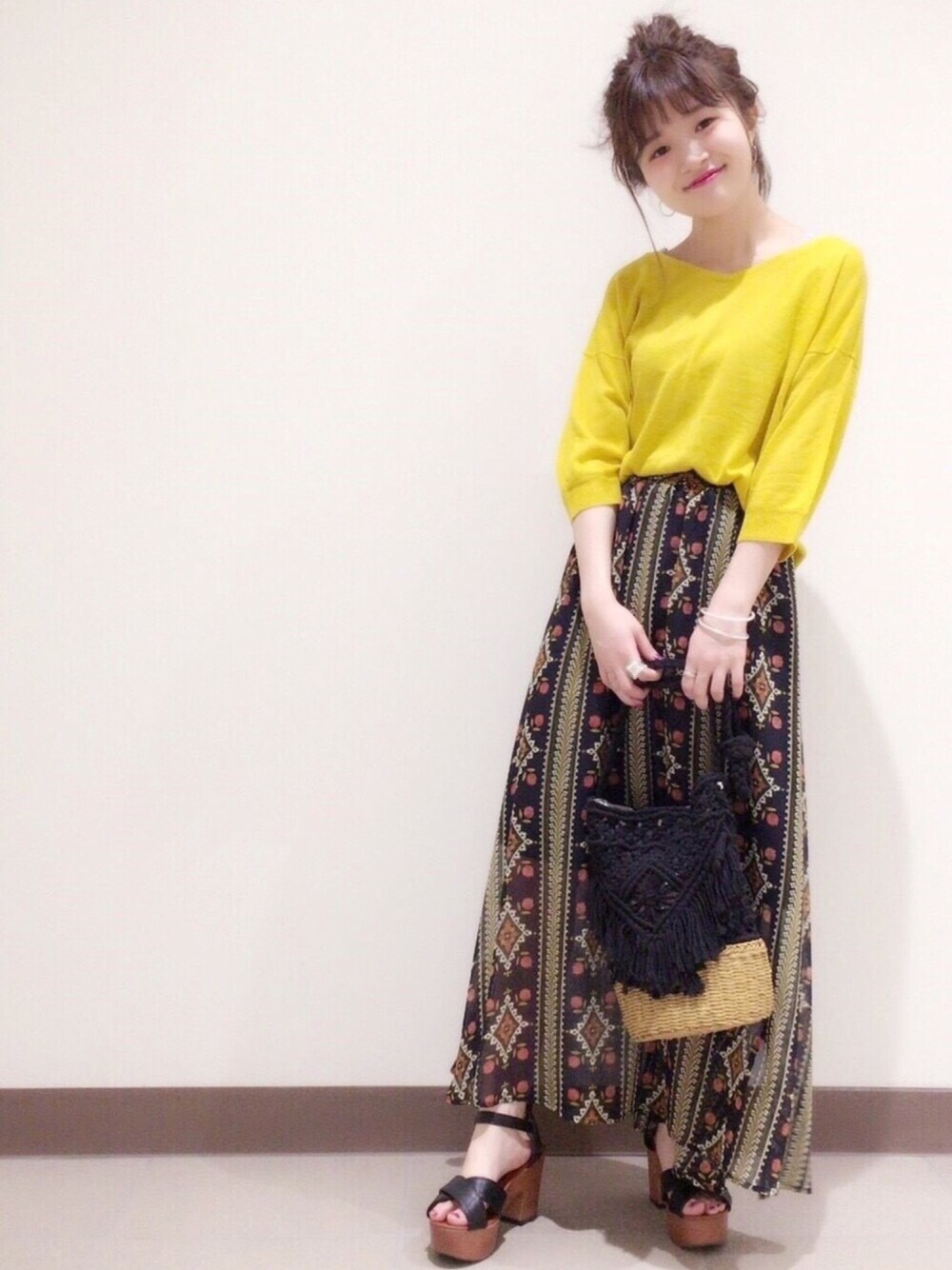 オリエンタルな柄のロングスカートでリゾート感あるカジュアルスタイル✨ イエローのニットは2way仕様! バックスタイルはリボンがポイントになっていて カーディガンとしても使えます💕 小物を黒で統一して大人な仕上がりに。。 🍥model:まるこ🍥 個性派カジュアルなまるこのwearもゼヒcheckしてみてください♩