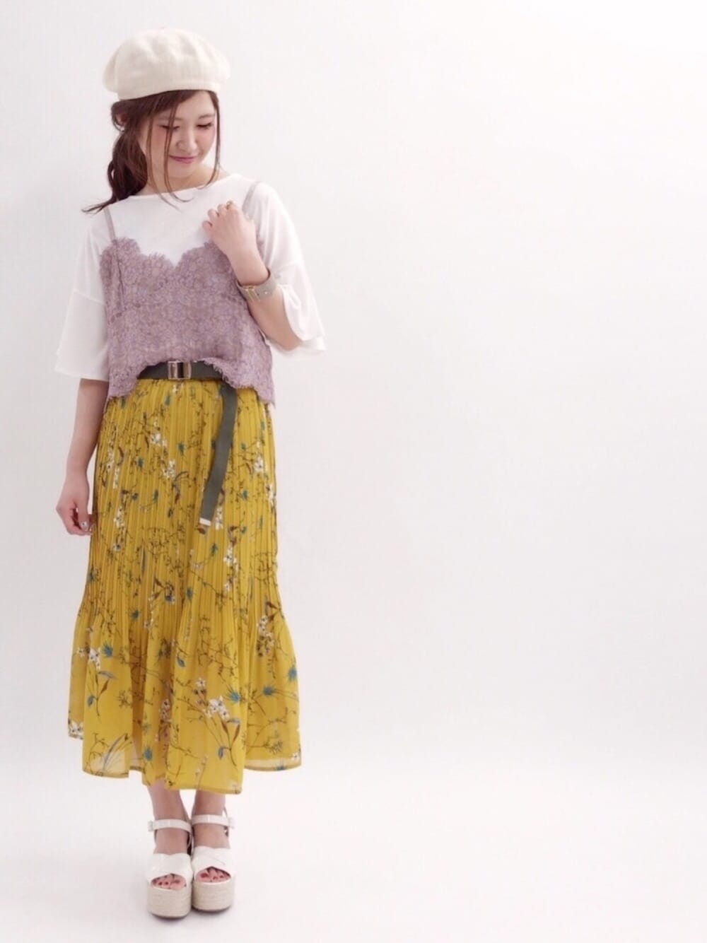 ピンク×イエローの 春カラーコーデ🌸 スッキリシルエットの 花柄スカートと レースビスチェで 大人ガーリーに💕 💐model:yoshimi💐 甘めカジュアルなyoshimiのwearもゼヒcheckしてみてください♩