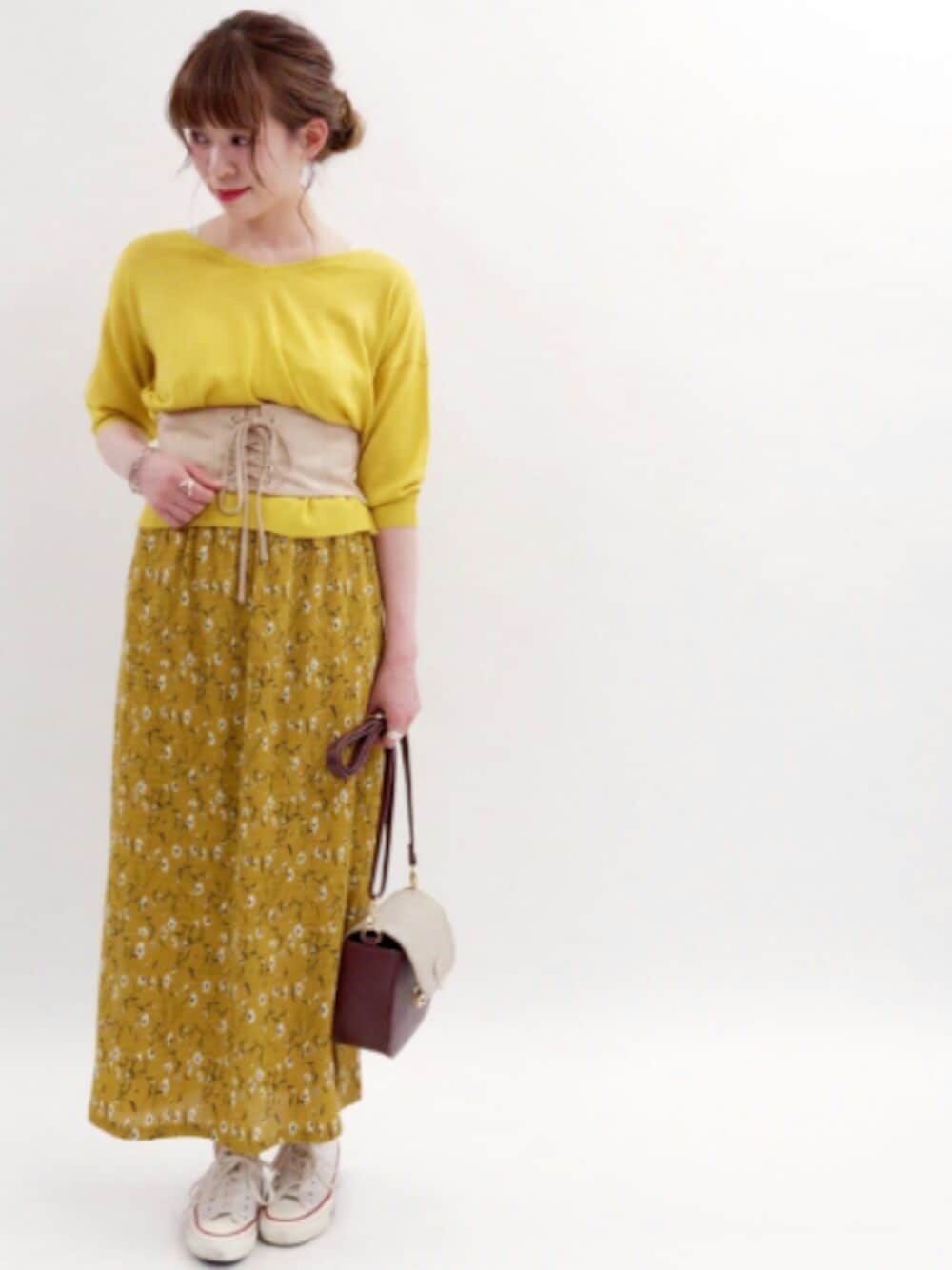 イエローのワントーンコーデに サッシュベルトをポイントに 足元はスニーカーで休日スタイル 💖model:akane💖 フェミニンコーデなakaneのSNSも ゼヒcheckしてみてください❤︎