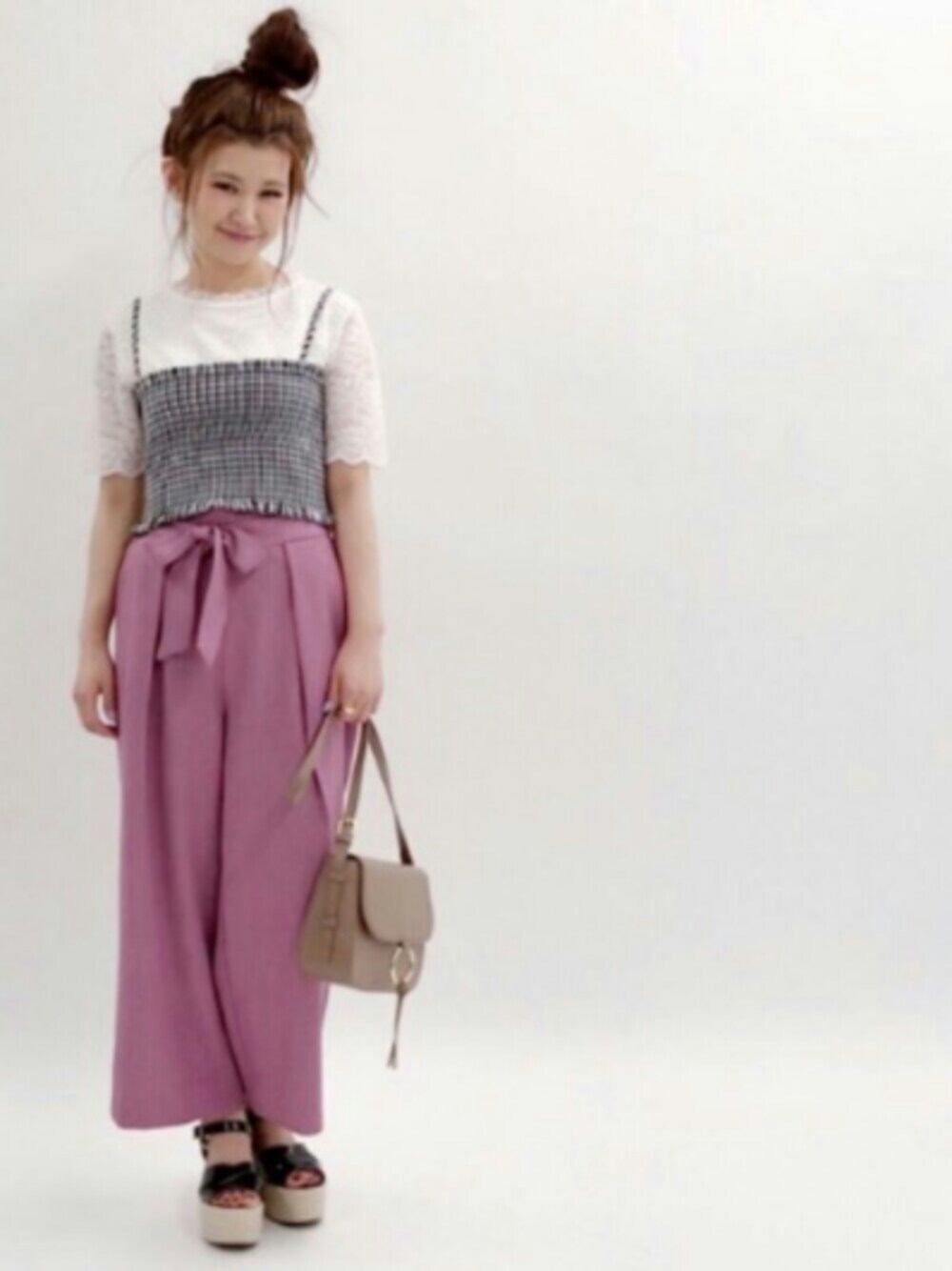 レーストップスとギンガムチェックの ビスチェでトレンドコーデ ワイドパンツでカラーをプラス 💐model:yoshimi💐 甘めカジュアルなyoshimiのwearもゼヒcheckしてみてください♩