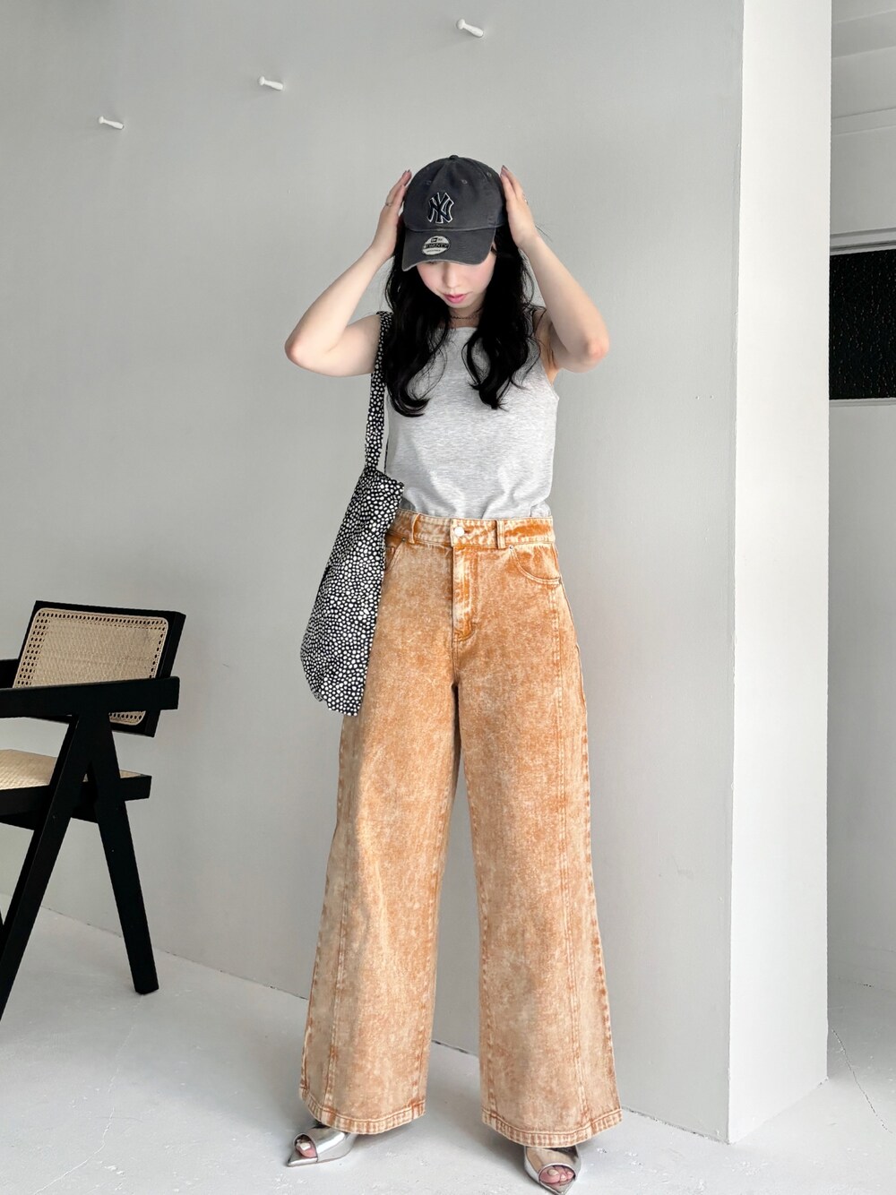 オレンジのケミカルデニムを主役にトップスはシンプルに🍊小物使いでストリート感をプラスしたのがポイント🧡