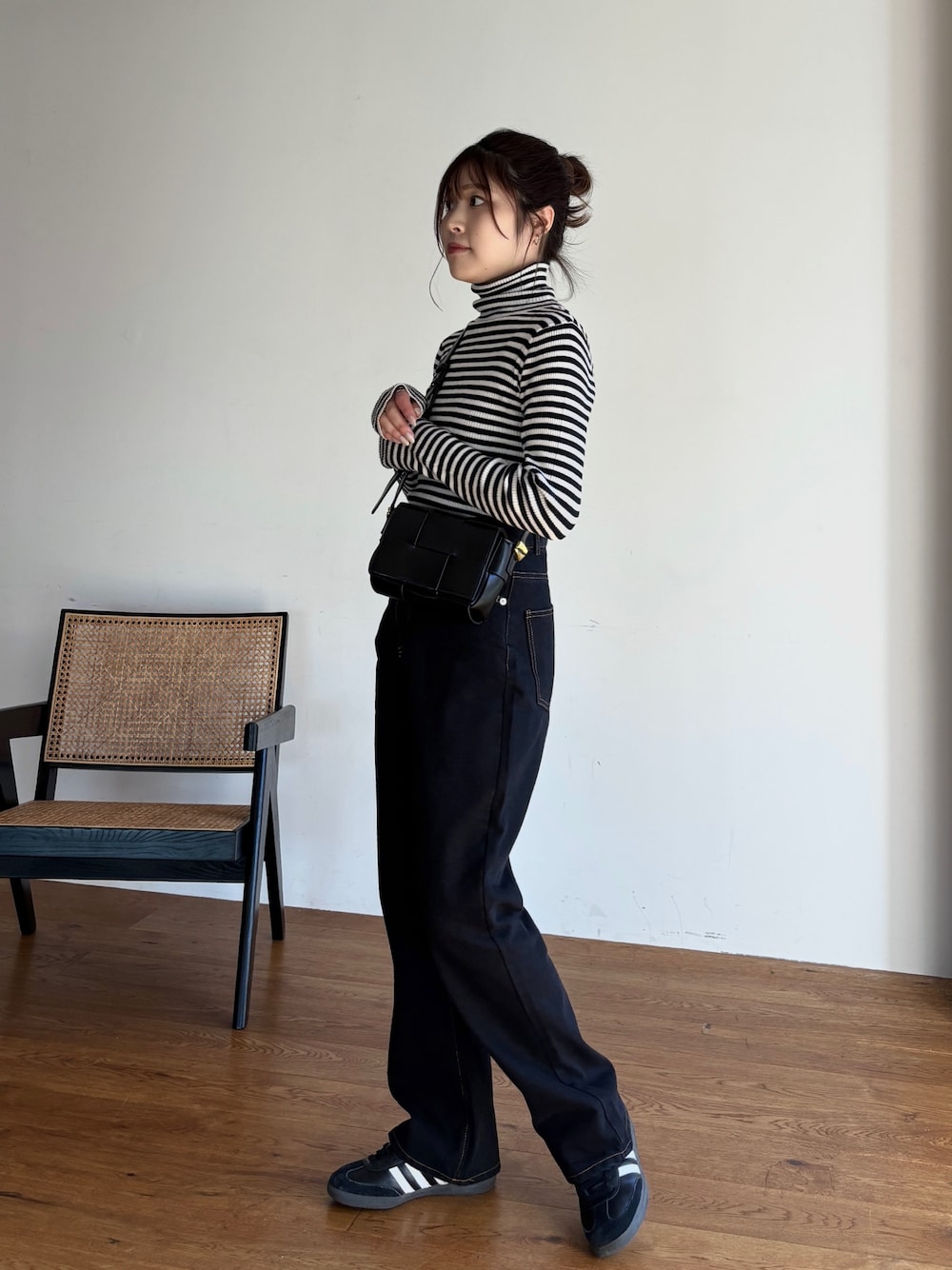体のラインが出るタートルネックにストレートの形が綺麗なデニムを合わせるととっても綺麗なシルエットになります✨