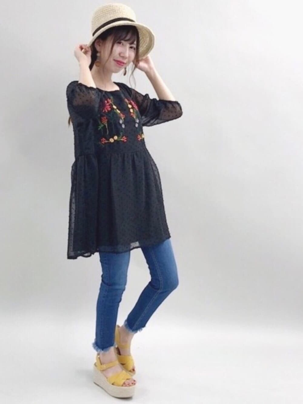 刺繍ワンピースをメインに カジュアルコーデ😊🌼 ワンピースの刺繍カラーがとっても可愛いんです😍 ◆ZOZO限定先行予約◆ SNSで大人気の刺繍ワンピースと ストレッチ抜群のヘムスキニーデニムが ZOZO限定で先行予約受付中♡