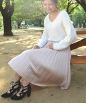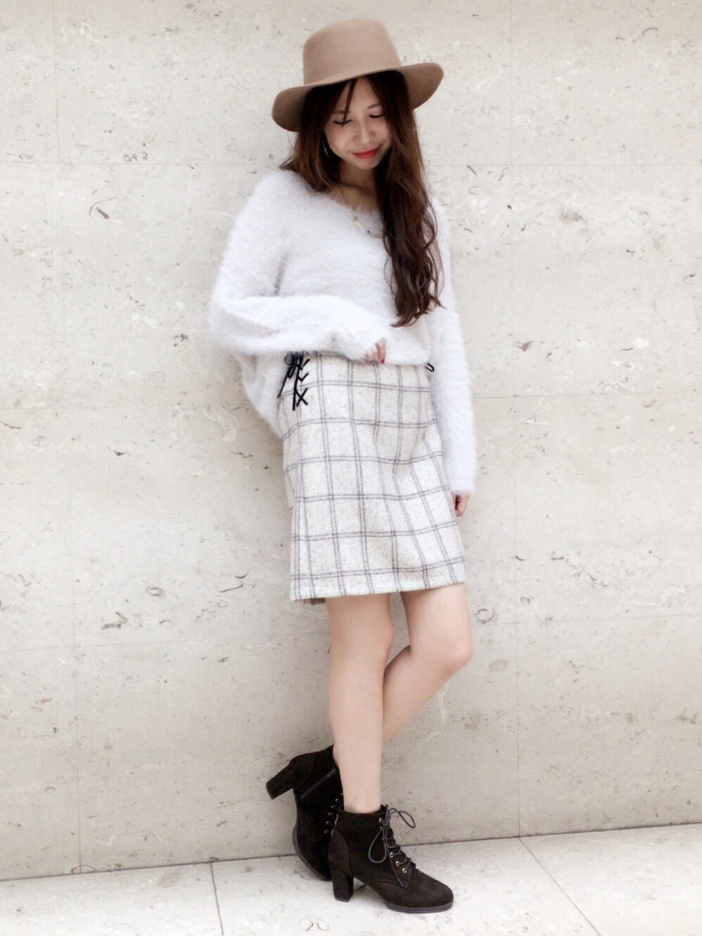 チェック柄のスカートはサイドレースアップがアクセントになっていてとっても可愛いです♡ フェザーニット合わせでとことんフェミニンに(*´ο`*)