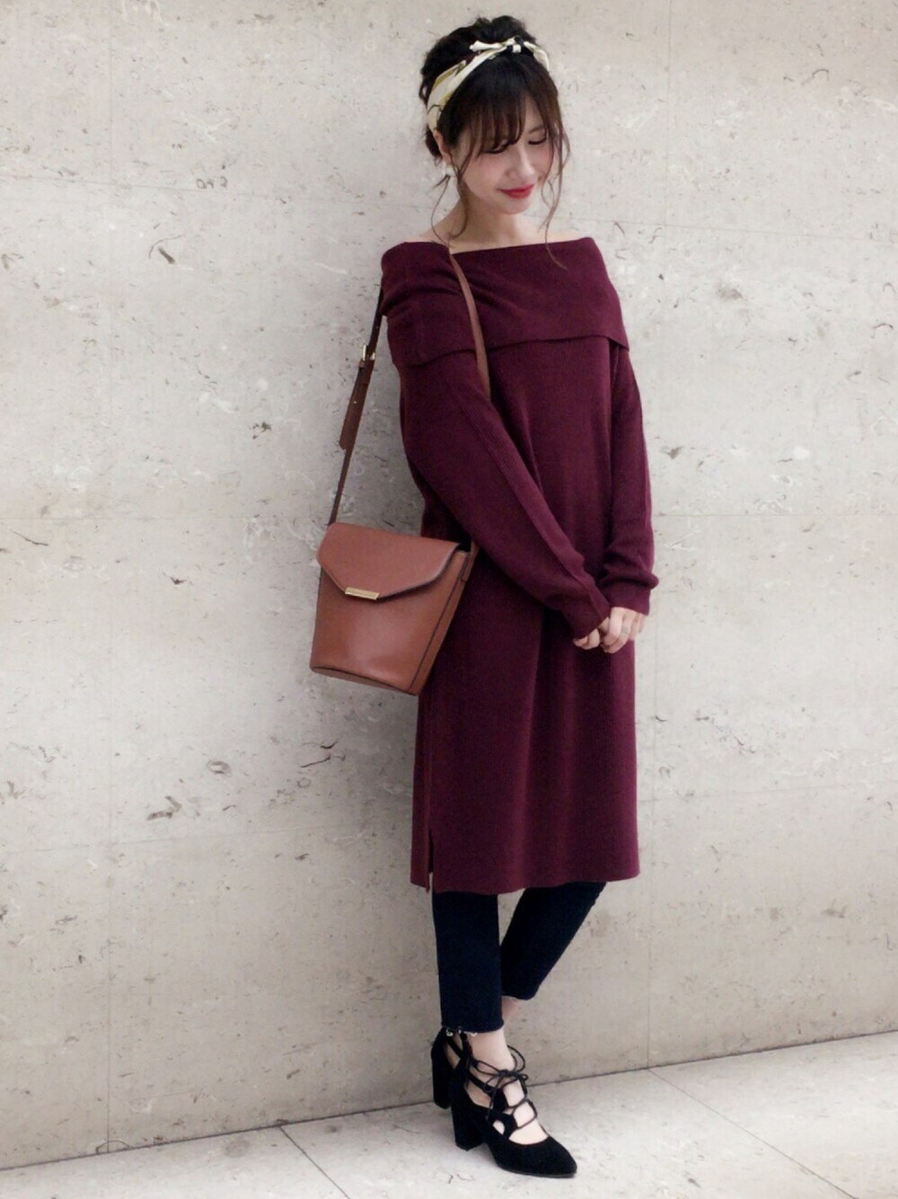 ニットワンピースもオフショルなら 今年らしい着こなしになります♡ スキニー合わせで大人スタイル( ˊᵕˋ )