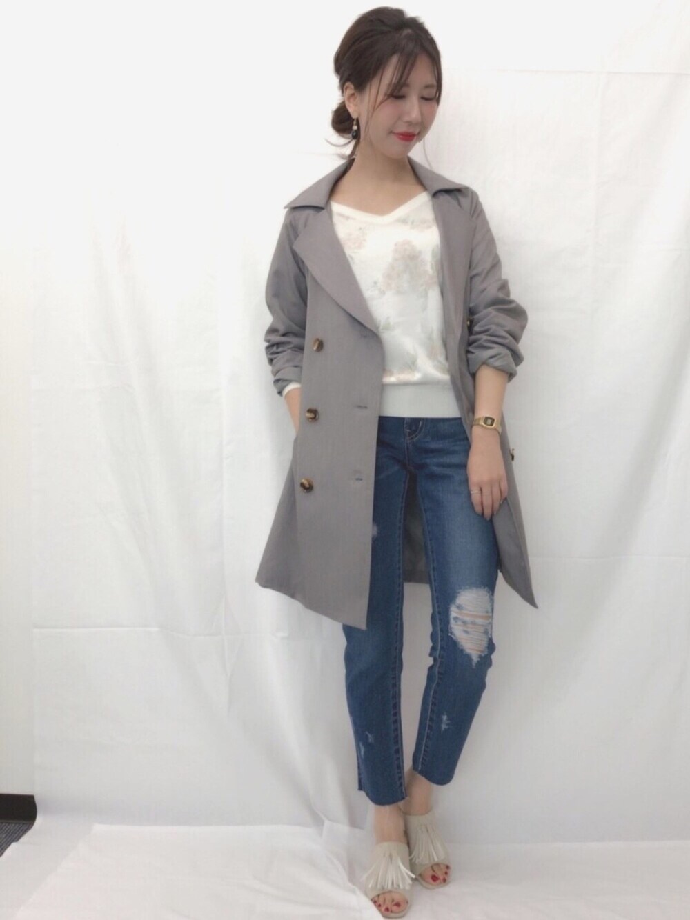 トレンチコートと 花柄ニットで春コーデ🌸 そろそろ花粉がひどい季節になってきました😭