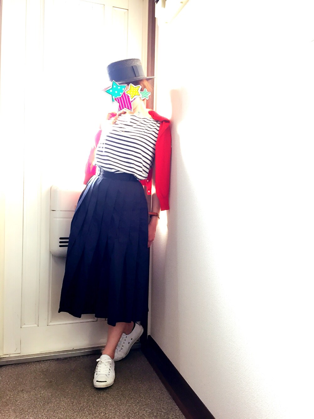 マリンスタイル⚓️ 差し色は赤にしました。 カンカン帽を、合わせてレトロ風に仕上げました。