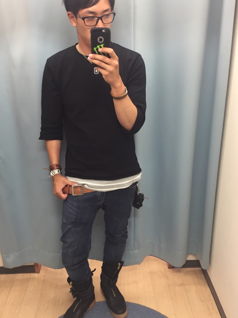 こんばんは〜 今回は七分袖のカットソーを合わせました。 腰回りにポイントをおいてベルトも斜めにつけてアクセントにしました😏 遊び心を忘れないようにしました😁