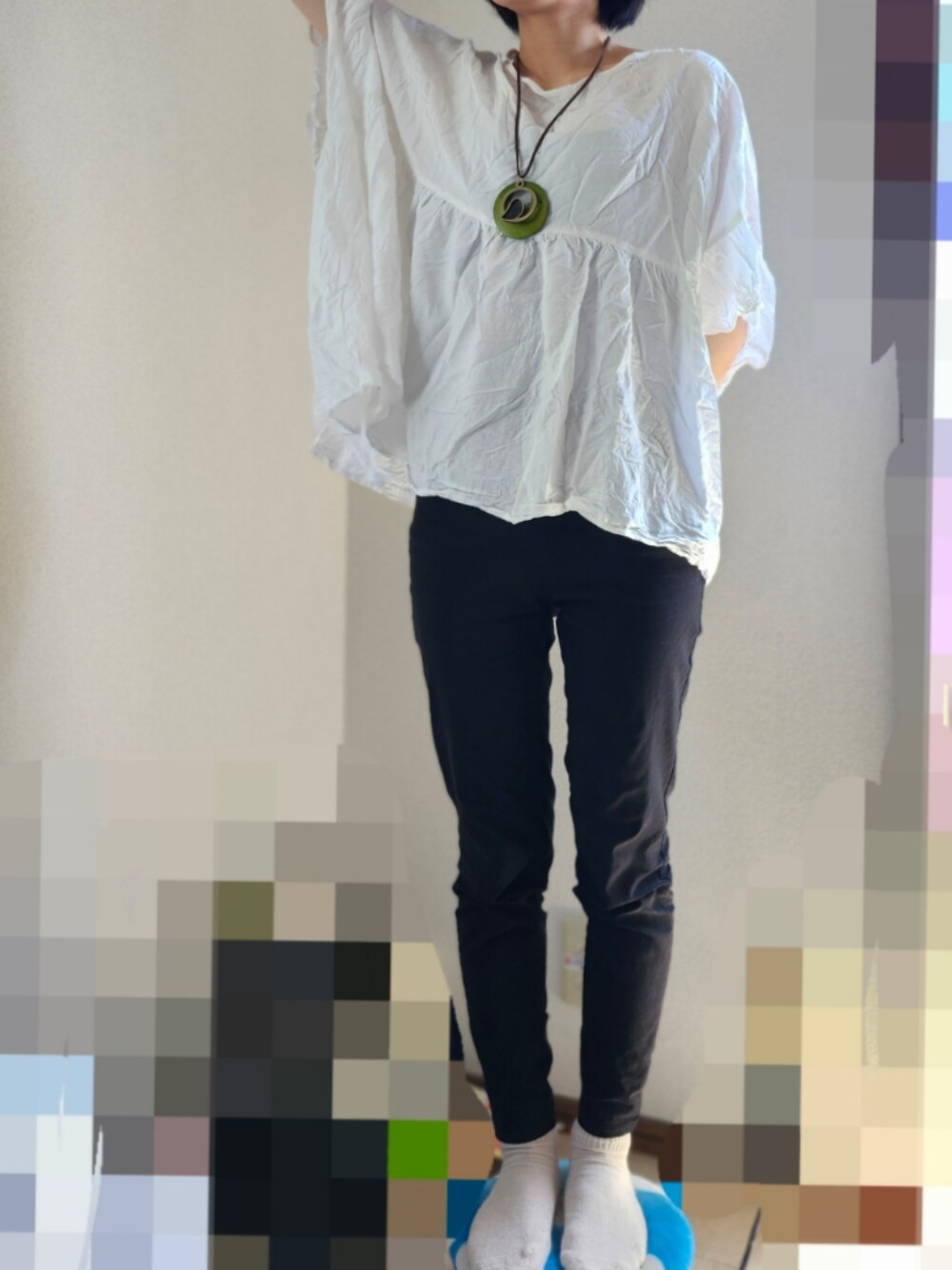 お気に入りのレギンスパンツをペプラムブラウスと合わせて清楚に動きやすく。