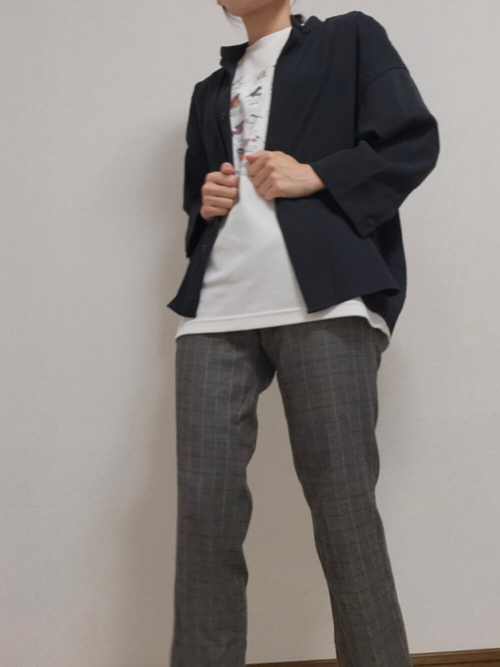 通勤の行きは2枚目(トップスとして)、帰りは1枚目(羽織として)で着ました。UNIQLOの使い勝手いいですね