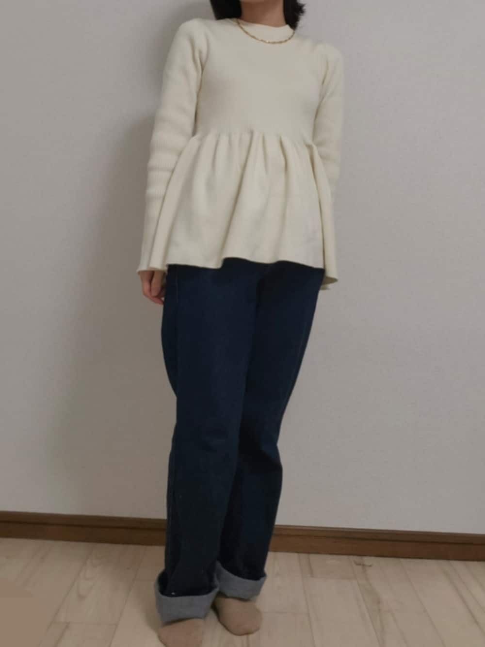 珍しくレイヤードせず、体型隠しペプラムニットに挑戦。太めのストレートデニムと合わせてみました