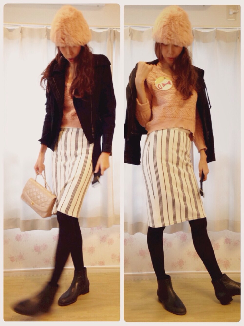 昨日との温度差ハンパない。 見えないけど、セーターは横のライン、スカートは縦のラインなのがいい感じ。 ファー帽子はベージュじゃなくてピンク。 足、デカッ! ライダースといえば、 5年くらい前にフリーズショップで売っていた裏地が薔薇柄のレザーライダースと、 一昨年くらいにアクアガールで売ってたウールのピンクのライダース、 買っておけばよかったなー! って今でも思い出す。。 ピンと来る服ってそうそう無いから、これからは買い逃さないように生きていきたいと思う今日この頃。
