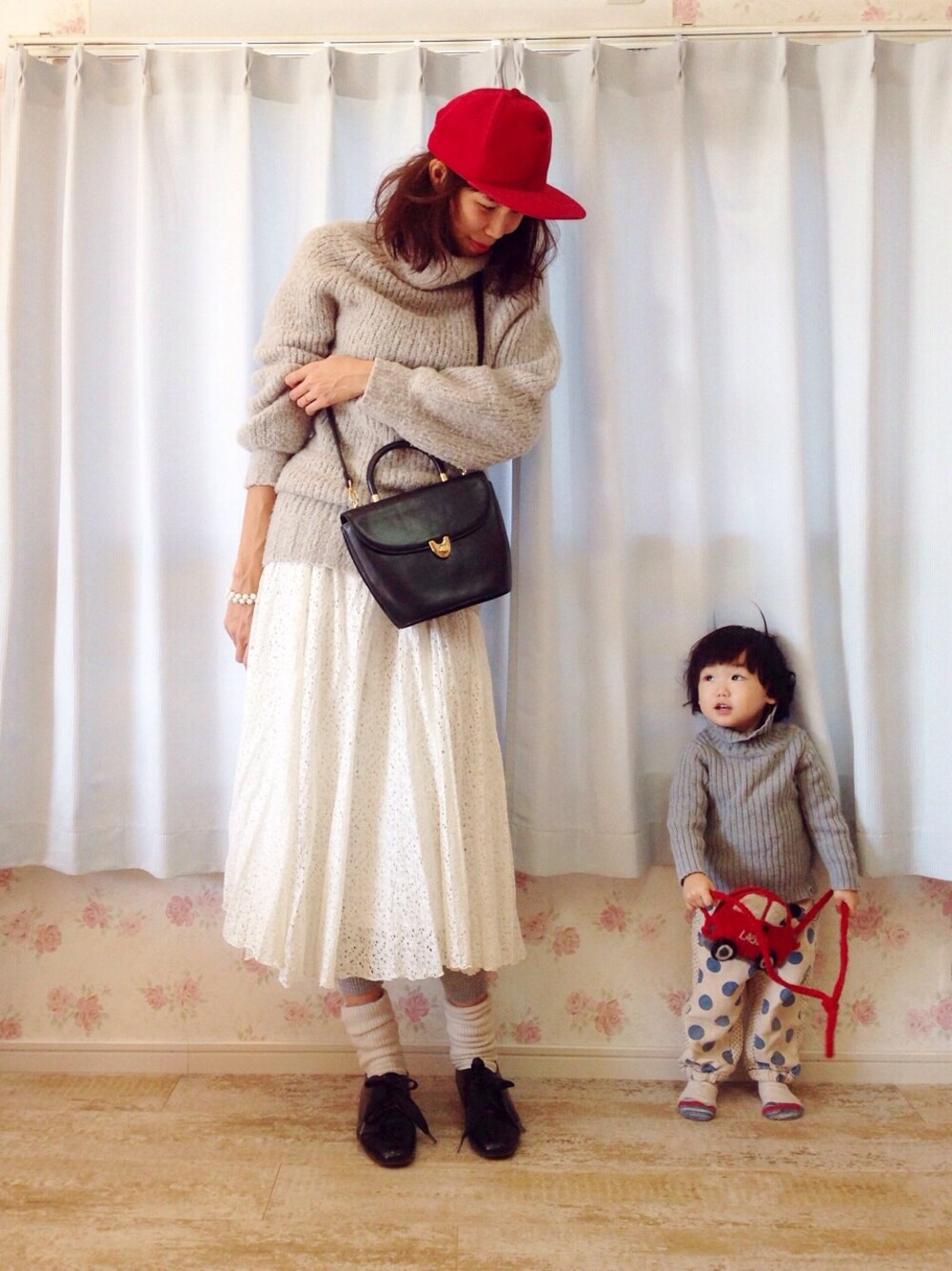 ゆる×ゆるシルエット。 グレータートルで息子とリンク♡ 私のタートルは今季のじゃないけど、 インにしても出してもワンピとしても着られて防寒バッチリお気に入り。 キャップは真っ赤に見えるけどワインレッドです。 息子が毎週のように熱出すからお洒落して出かける時がないよー