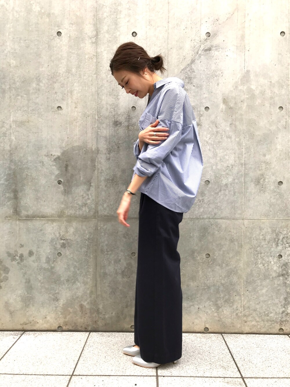 ワイドシルエットのシャツを主役にしました。抜き襟はマストです◎