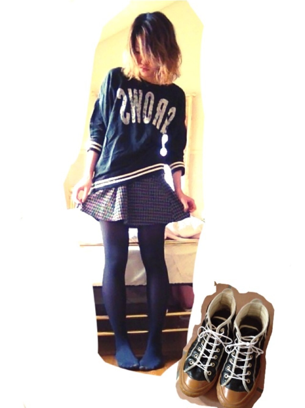 ロゴスウェット:WEGO 千鳥柄サーキュラースカート:HARE メンズハイカット: 着替えた、今日はちょっとだけあったかい。