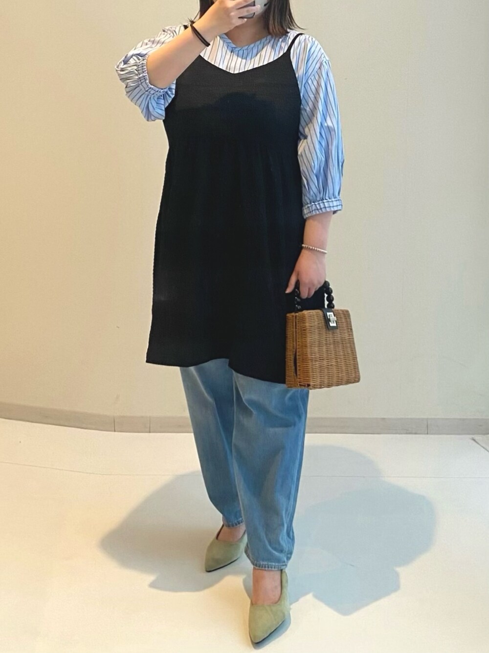カットソー楊柳チュニック+5分袖リブTシャツの キャミチュニックを使用したコーディネート🌟