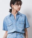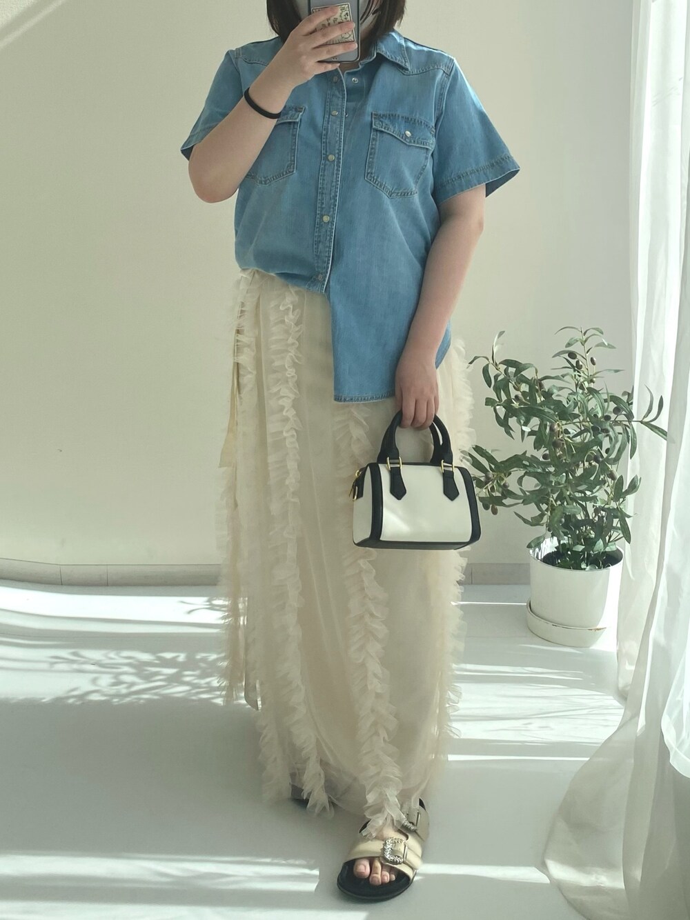 特徴的なスカートを使ったコーデ🌟 巻きスカートになっていて、取り外しが可能なので 着回し力抜群です✨ デニムシャツもジャストサイズで着やすい◎