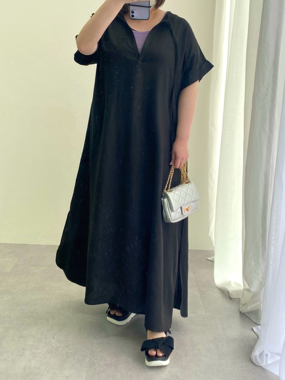 お気に入りワンピを使ったコーディネート🌟 今回はシンプルにボトムを合わせず着てみました。 インナーには黒と相性抜群なパープルを合わせています◎ サンダルはリボンが付いた可愛いデザインで 甘辛コーデにしてみました!